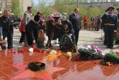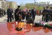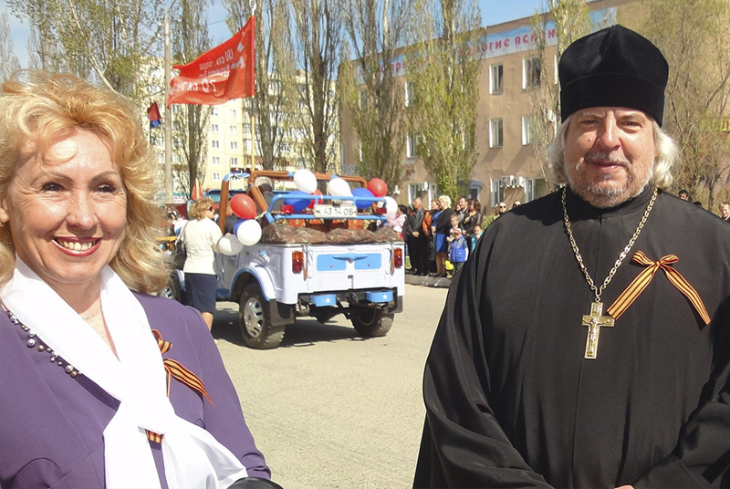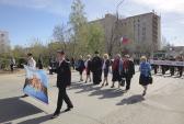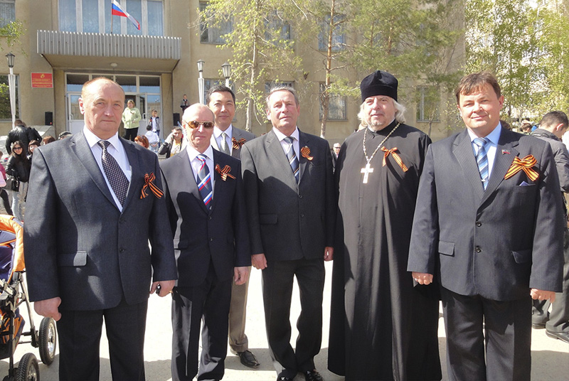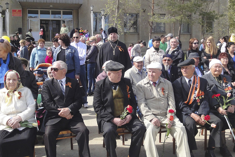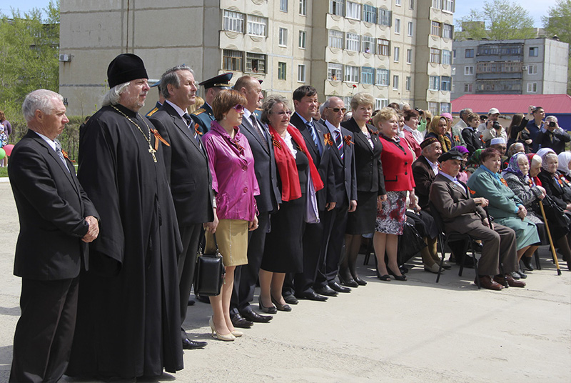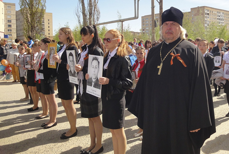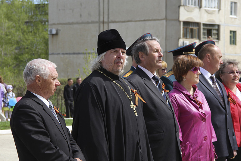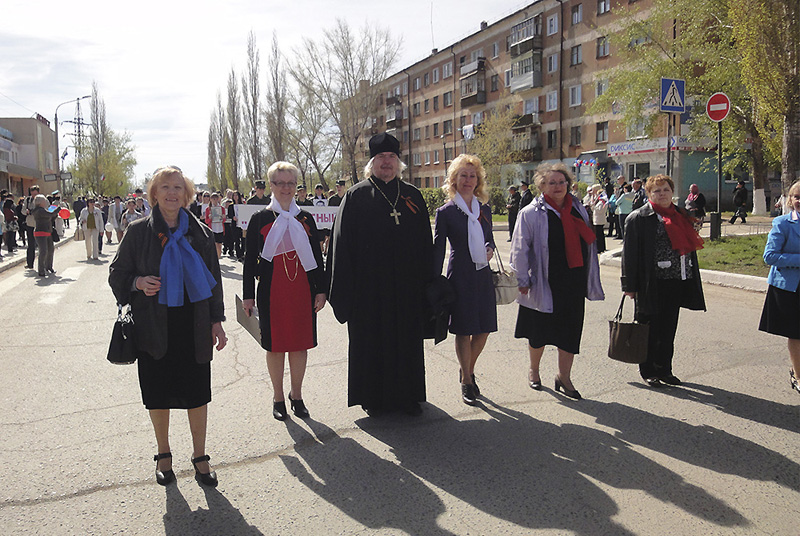 С утра колонны демонстрантов сливались в одну общую, чтобы подойти к ветеранам у Дома Искусств и затем шествовать к обелиску Славы. Игумен Онисим с работниками администрации и образования возглавлял эту колонну, что подчеркивало единение народа, Церкви и армии. Священник, отцы города и района вместе с ветеранами поблагодарили школьников, которые приветствовали героев войны.