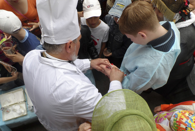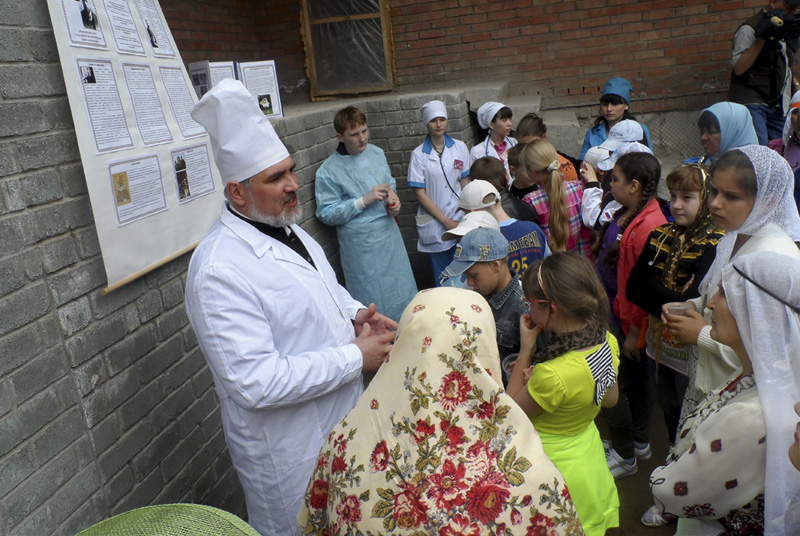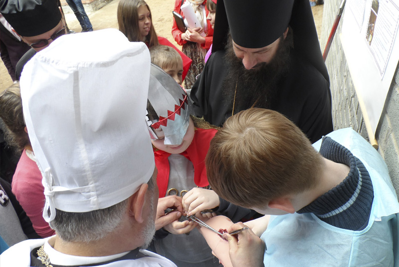 Дети и взрослые окружили хирурга - священника Вячеслава Кочкина, - который имеет не только духовное образование. Священник закончил Оренбургскую медицинскую академию и клиническую ординатуру на кафедре общей хирургии ОГМА. До получения духовного сана десять лет работал по специальности и продолжает работать врачом-хирургом в Адамовской РБ. Поэтому разговор о профессии врача получился очень интересным и наглядным. Батюшка показывал технологию наложения операционного шва. Многие из присутствующих попробовали выполнить эту сложную манипуляцию.