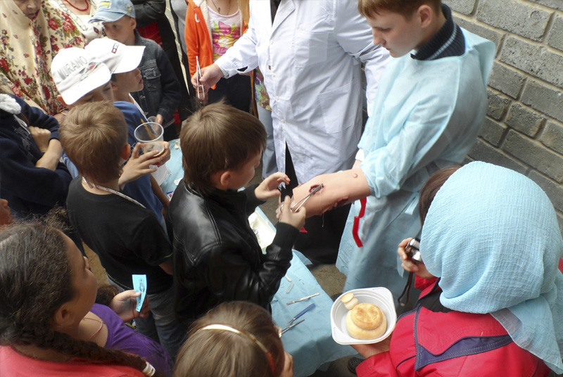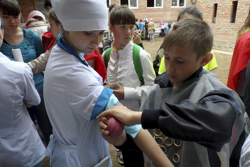 Также были задействованы в работе медицинской станции студенты ГМК: учили школьников накладывать кровоостанавливающий жгут и делать повязки, измеряли артериальное давление у взрослых и проверяли смекалку ребят загадками о медицине.