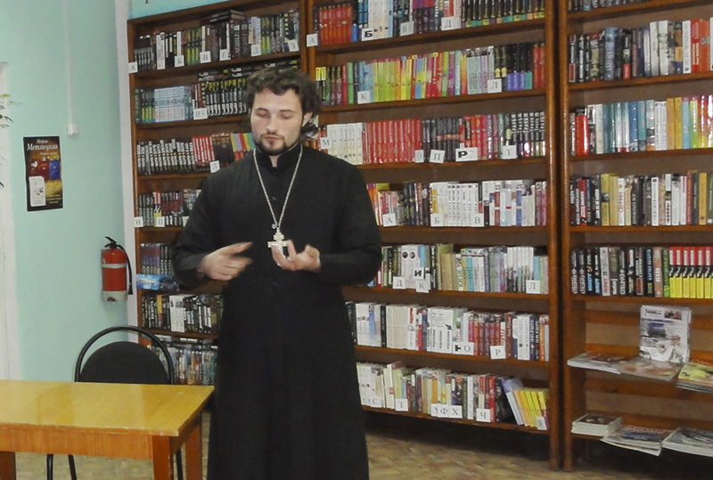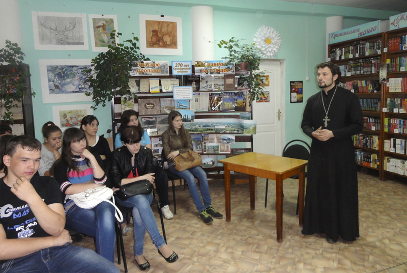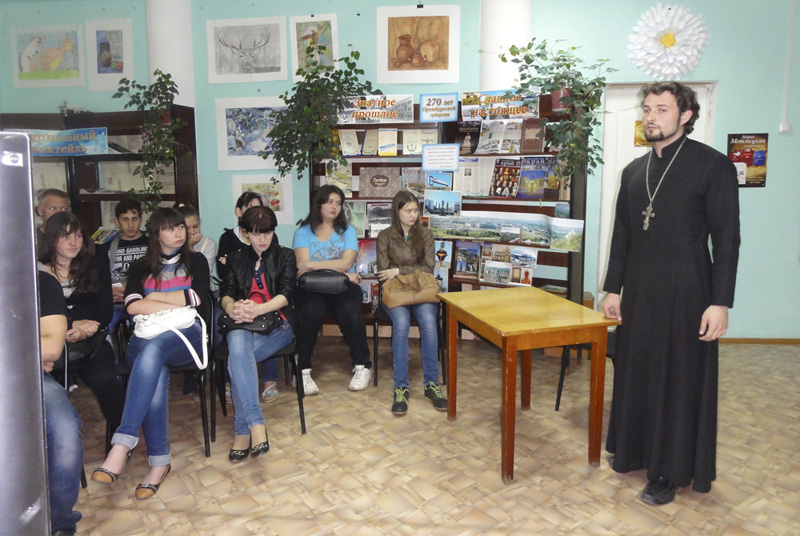 МЕДНОГОРСК. 21 мая 2014 г. В здании Центральной библиотеки города Медногорска прошла встреча настоятеля храма святителя Николая Чудотворца (микрорайона «Южный») иерея Максима Малюты с учащимися Медногорского индустриального колледжа.