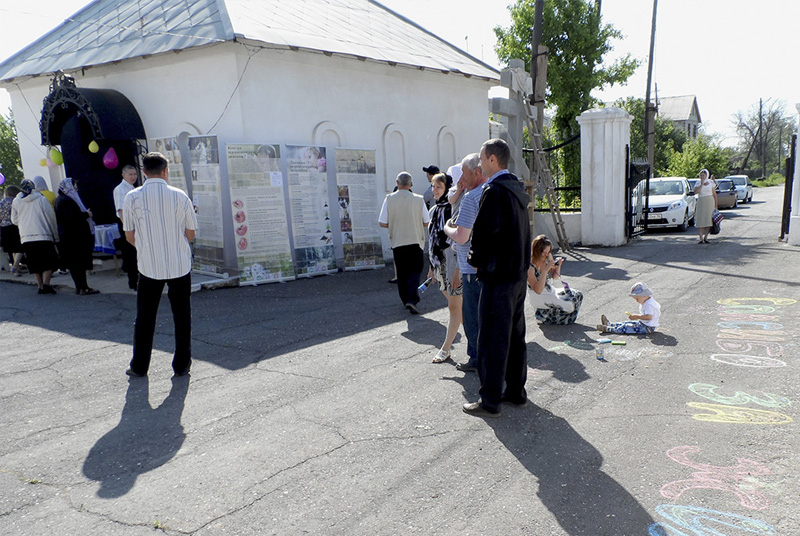После службы на территории церковного двора прихожане знакомились с мобильной выставкой «Человеческий потенциал России», предоставленной епископу Иринею руководителем Оренбургского движения «За жизнь» Вячеславом Мошковым в апреле прошлого года.