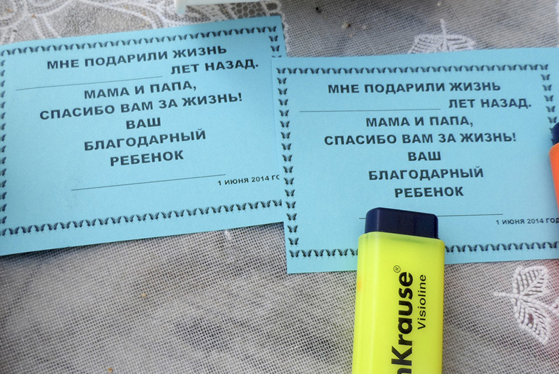 Мальчики и девочки не упустили возможности поблагодарить своих родителей за когда-то подаренную жизнь. Это можно было сделать, заполнив оригинальную открытку со словами: «Мама и папа, спасибо за жизнь!».