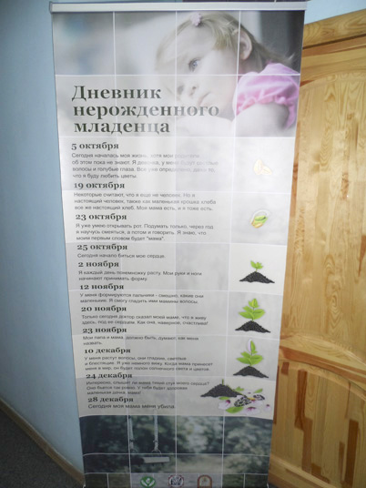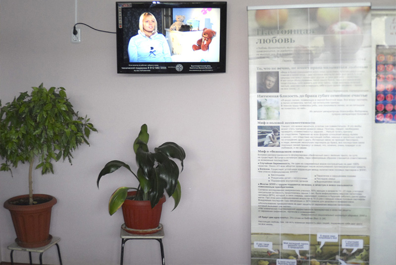 Помимо этого в медицинском учреждении применяется демонстрация видеороликов и набора моделей человеческих эмбрионов наглядного пособия «Ощущение жизни». Беседы с женщинами, буклеты и плакаты в помещении – всё нацелено на сохранение беременности.