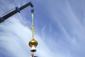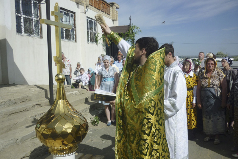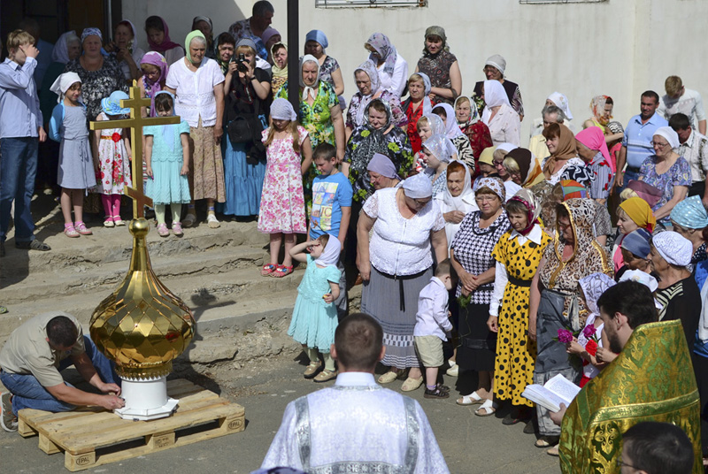 После Литургии и водосвятного молебна настоятель храма иерей Вячеслав Коротков и вся паства собрались на улице у входа, где под пение молитв купол был поднят вверх и установлен на свое почетное место. На солнышке, переливаясь и сверкая в День Святой Троицы, в день зарождения Церкви, храм получил свой дар.