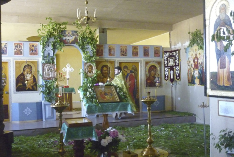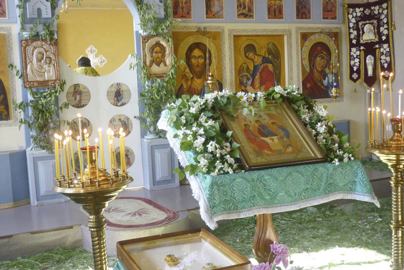 С вечера храм украсили душистыми пионами и жасмином, веселыми ромашками, веточками березы, а пол устлали мягкой весенней травой. Храм преобразился и наполнился ароматами леса – духом жизни. Все это и символизирует Святую Троицу, дающую всему жизнь. Отрадно было видеть, сколько людей пришло ради святого праздника.