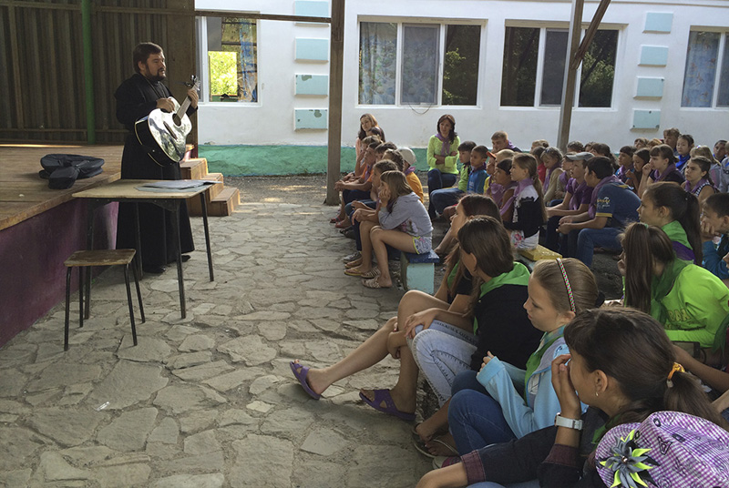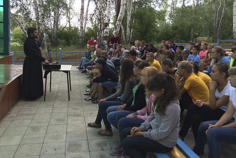 МЕДНОГОРСК. 11 июля 2014 г. Настоятель храма святителя Николая Чудотворца посёлка Заречного иерей Андрей Пелипенко посетил детские оздоровительные лагеря «Лесные долины» и «Лесная сказка», расположенные в лесном массиве, прилегающим к городу Медногорску.