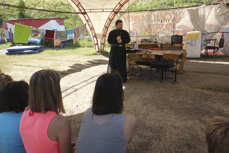 МЕДНОГОРСК. 16 июля 2014 г. Настоятель храма святителя Николая Чудотворца г. Медногорска (п. Заречного) иерей Андрей Пелипенко посетил детский летний палаточный лагерь, который расположился в Кувандыкском районе на берегу реки Сакмары.