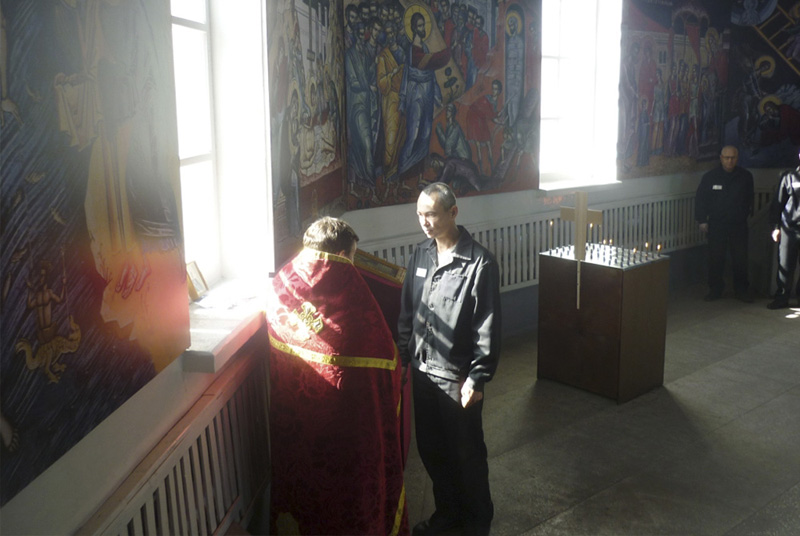 НОВОТРОИЦК. 28 июля 2014 г. В день почитания святого равноапостольного великого князя Владимира настоятель храма Казанской иконы Богородицы иерей Вячеслав Коротков и настоятель храма Покрова Пресвятой Богородицы п. Кумак иеромонах Феодор (Липкин) отслужили Божественную Литургию в ИК 25/5 Новотроицка.