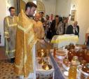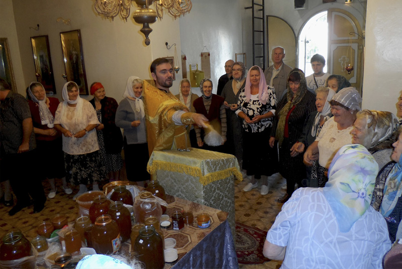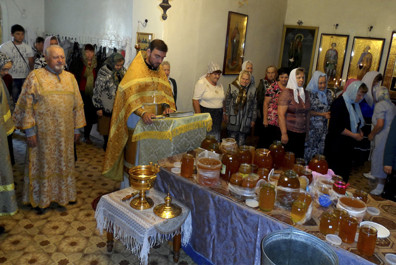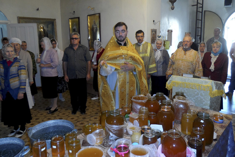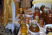 После Литургии по уставной традиции батюшка совершил чин малого освящения воды, освятил новый урожай меда и в честь Медового Спаса окропил собравшихся святой водой.