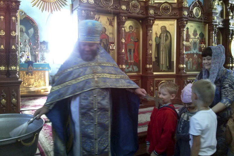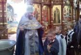 У амвона была установлена чаша и батюшка, вручая учащимся иконки Пресвятой Богородицы, каждого окроплял святой водой.