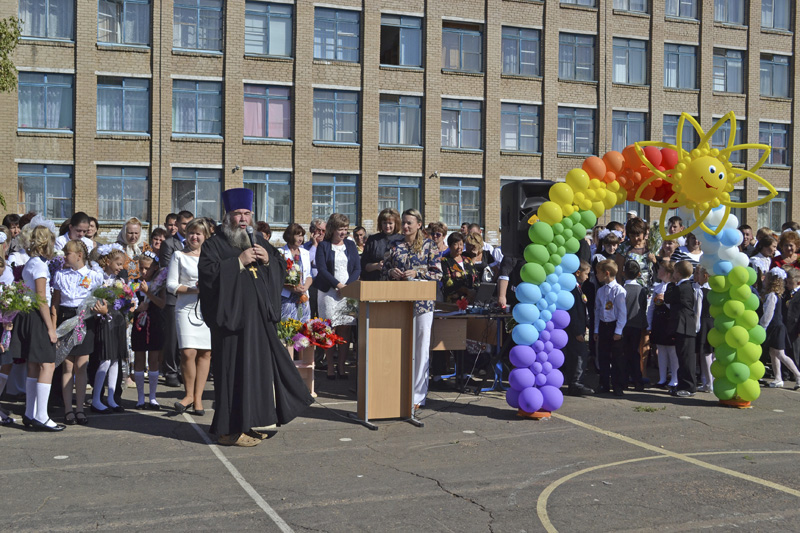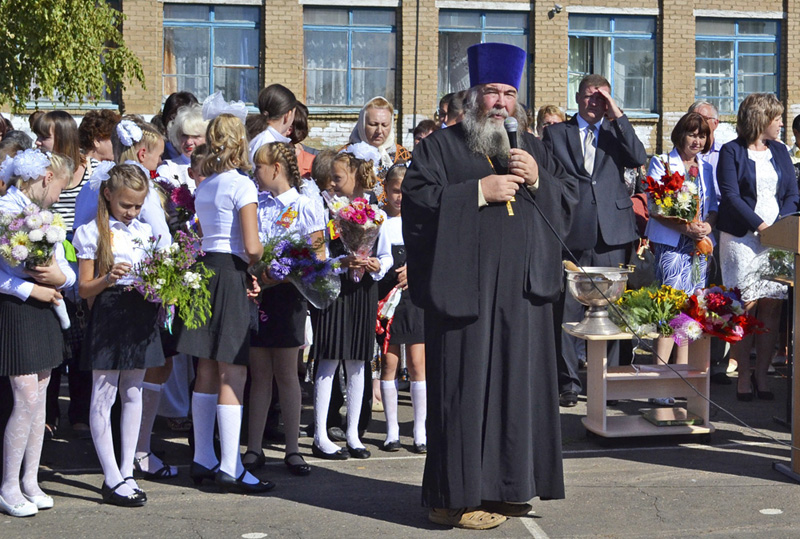 ЭНЕРГЕТИК. 1 сентября 2014 г. Настоятель храма святого великомученика и Победоносца Георгия иерей Алексий Новиков поздравил учащихся школы № 2 п. Энергетик с началом учебы.