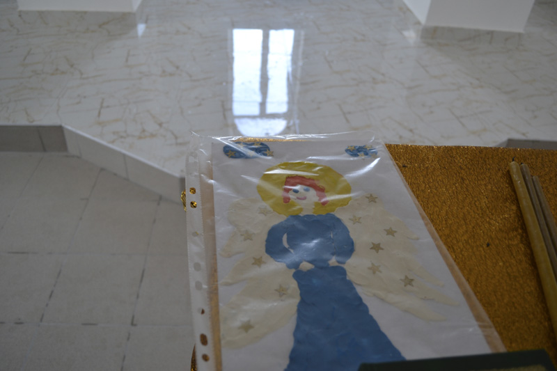 Затем было трогательное поздравление учеников младшего класса стихотворением, написанным преподавателем школы. Дети вручили владыке рисунок Ангела-хранителя, исполненный в технике рисования пластилином, которую они освоили во время работы летнего лагеря.