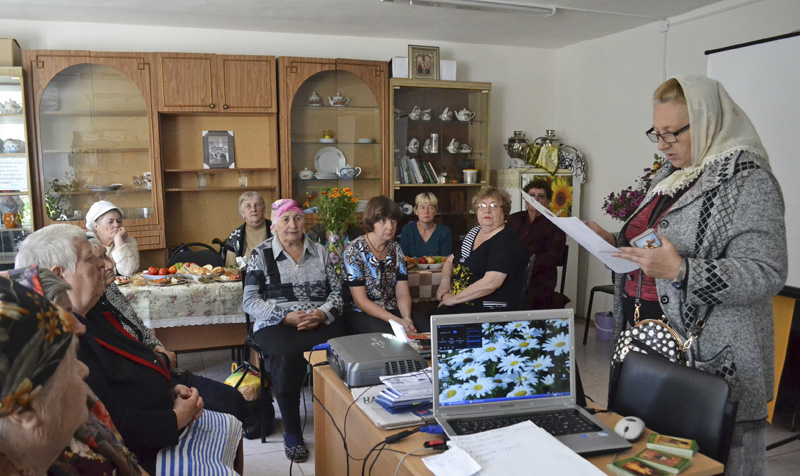 В гостевом зале библиотеки собрались люди с ограниченными возможностями. Матушка поздравила их с праздником, пожелала всех благ и рассказала о празднике Усекновения главы Иоанна Предтечи. Рассказ плавно перешел в беседу. Люди зрелого возраста задавали свои вопросы на православную тему матушке и с неподдельным интересом слушали на них ответы. По окончании импровизированной беседы все присутствующие получили в дар от матушки Татьяны иконки святого великомученика Георгия Победоносца, небольшие сладкие подарки и православную литературу. В знак же своей благодарности за внимание и заботу к себе жители поселка вручили матушке букет цветов.
