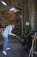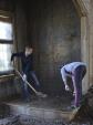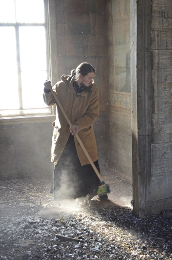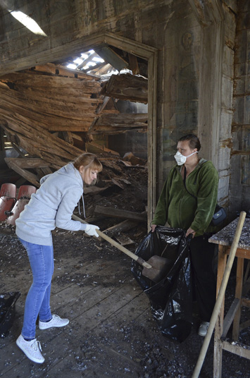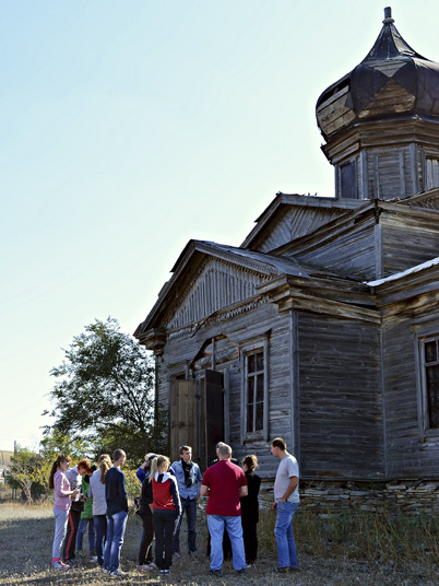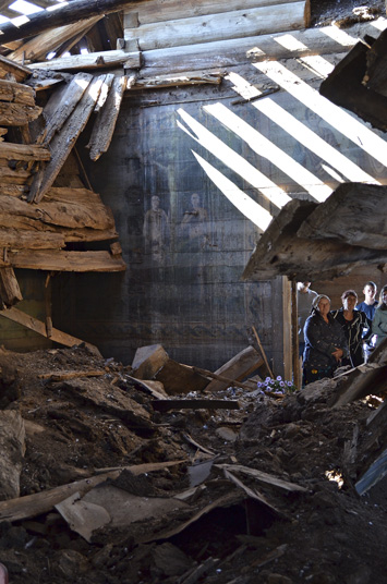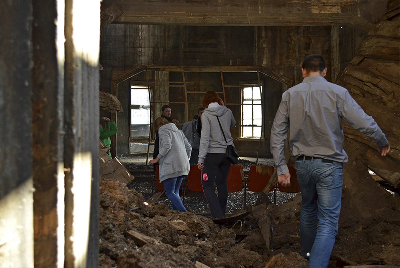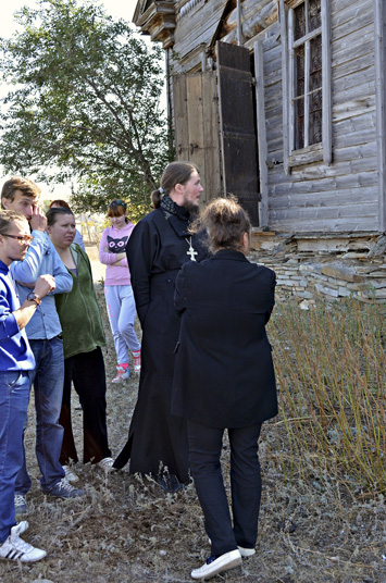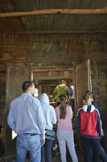 Местные жители поначалу встретили молодых людей с недоверием, поскольку, как они позже объяснили нам, слишком много праздных туристов приезжает посмотреть на церковь. Когда узнали, с какой целью мы приехали, то оказали посильную помощь: пригнали большой бортовой ЗИЛ, в кузов которого ребята начали ссыпать мусор, накопившийся в храме, а также дали бензопилу, чтобы срезать части обвалившегося перекрытия.