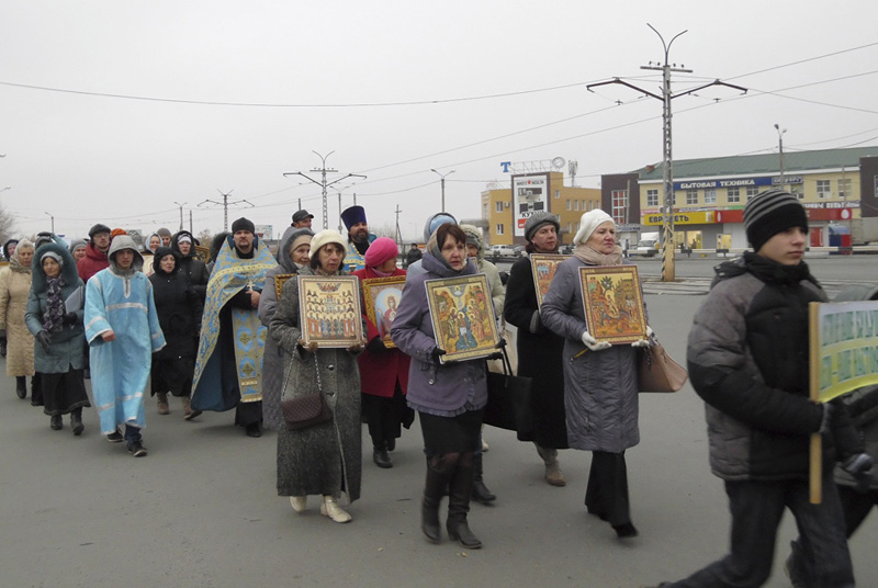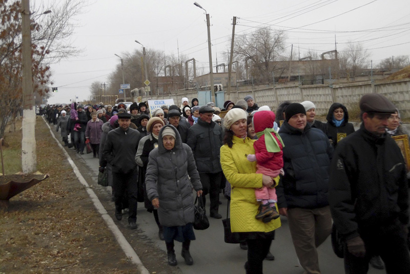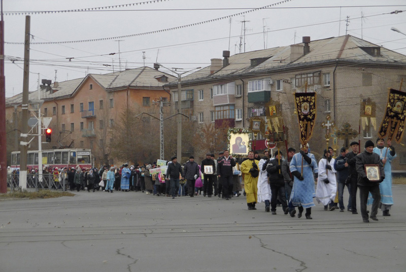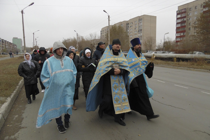 После Божественной литургии прошёл молебен с водоосвящением, по окончании которого прихожане храма совершили крестный ход по городу Новотроицку. По дороге у моста произошла встреча со вторым крестным ходом, который следовал из больничного храма св. вмч. и целителя Пантелеимона г. Новотроицка во главе настоятелем храма иереем Евгением Селиверстовым. Два крестных хода, соединившись в единый, продолжили путь с «Казанской» иконой Пресвятой Богородицы до строящегося храма Благовещения Пресвятой Богородицы. Шествие собрало около семисот верующих жителей города. В нем приняли участие воспитанники воскресной школы имени св. бл. князя Александра Невского при Петропавловском соборе. Они шли в начале колонны за священнослужителями, неся в руках иконы.