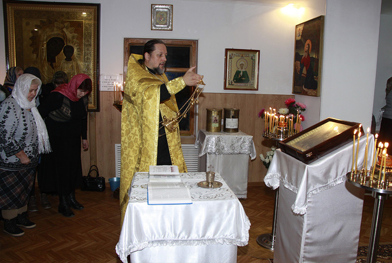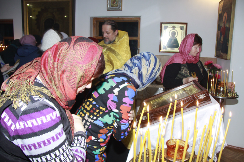 Сразу же по прибытии отец Герман совершил у чудотворной иконы молебен с акафистом Пресвятой Богородице, вместе с прихожанами обращаясь с молитвой к Божьей Матери, чтобы Она творила милость роду человеческому, Своими слезами умягчая иссохшие сердца людей. По окончании молебна настоятель помазал всех прихожан чудотворным миром, истекающим с образа.