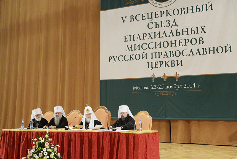 С Первосвятительским словом к участникам Съезда обратился Святейший Патриарх Кирилл. В начале своего выступления Предстоятель Русской Церкви с сожалением констатировал отсутствие на Съезде председателей миссионерских отделов многих епархий и заявил о необходимости приглашения на подобные мероприятия в будущем миссионеров из благочиний для полноценного диалога о задачах церковной миссии. Святейший Владыка выступил с критикой отдельных направлений миссионерской работы в Церкви и настоятельно призвал более интенсивно «развивать миссию на всех уровнях: общецерковном, епархиальном, благочинническом и приходском».
