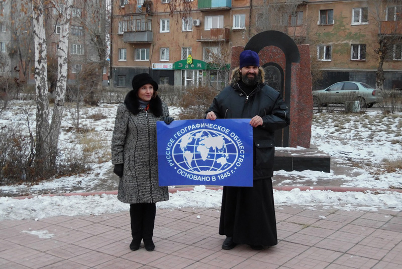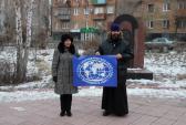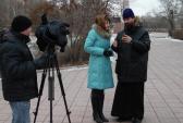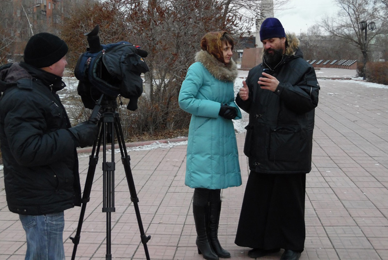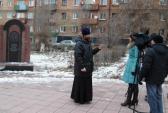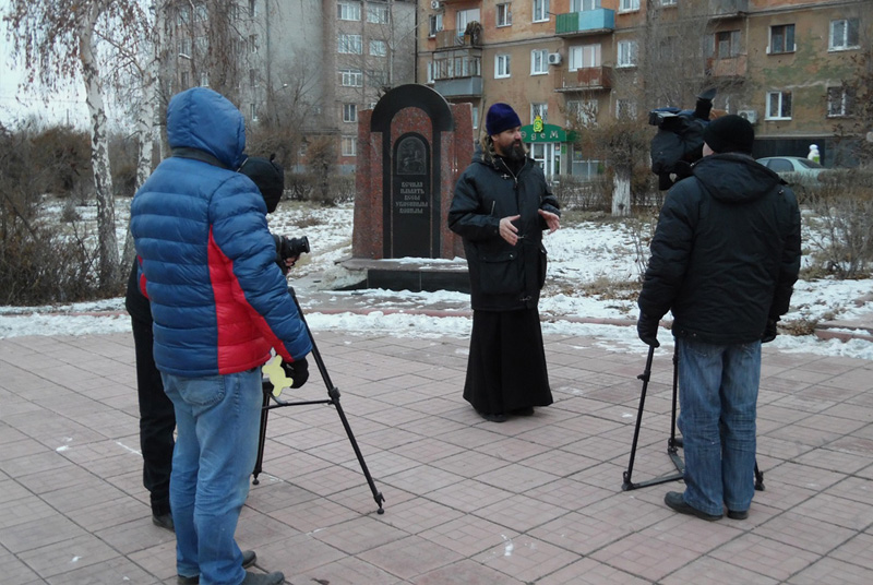 НОВОТРОИЦК. 30 ноября 2014 г. Благочинный Новотроицкого округа протоиерей Сергий Кваша рассказал съёмочной группе из г. Оренбурга о памятнике «Георгия Победоносца».