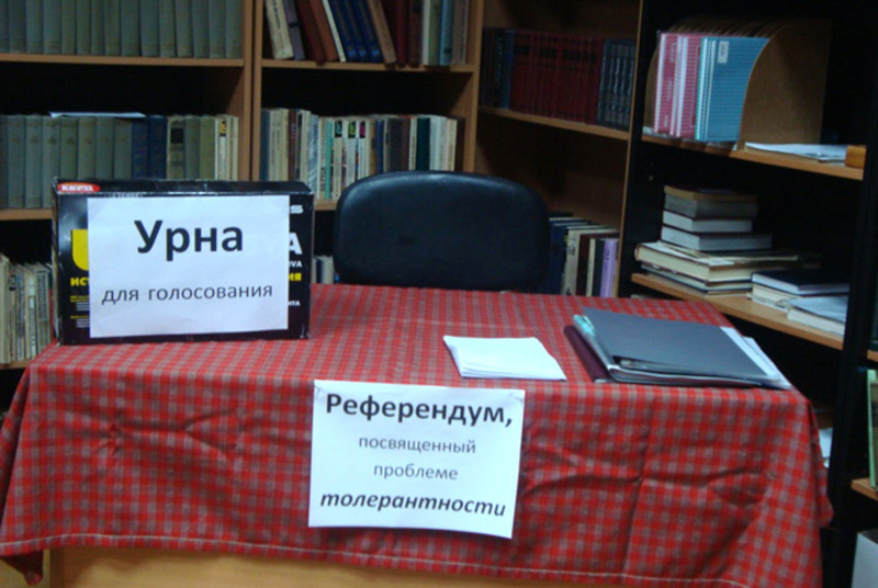 Ребята отвечали на вопросы, касающиеся проблем толерантности в нашем обществе. Из 60 гимназистов в голосовании приняли участие 47 человек. Испорченных бюллетеней не было. Результаты референдума получились такими. На вопрос: «Сталкивался ли ты с проявлениями национальной нетерпимости к другим народам?» поступили ответы «да» от 23 человек, «нет» - от 24 человек. На вопрос: «Гордишься ли ты Оренбуржьем, где дружно проживают много людей разных национальностей?» ответили «да» 45 человек, «нет» - 2 человека. На вопрос: «Является ли ваша школа пространством толерантности?» ответили «да» 47 человек, «нет» - 0 человек. На вопрос: «Хотел бы ты пропагандировать единство народов России?» ответили «Уже это делаю» 11 человек, «Пусть этим занимаются взрослые» - 26 человек, «Хочу пропагандировать культуру только своей национальности» - 10 человек.