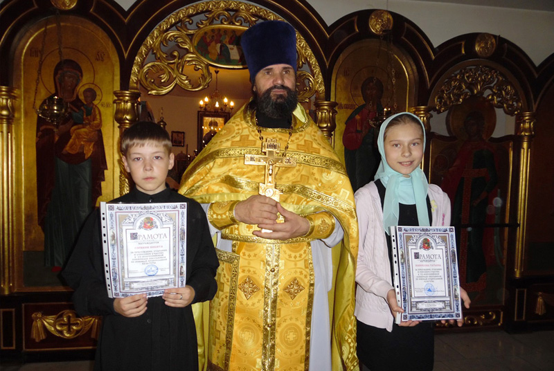 Затем батюшка вручил грамоты благочинного Новотроицкого округа победителям муниципального этапа Олимпиады по Основам православной культуры. Грамоты были вручены воспитанникам воскресной школы им. св. блв. кн. Александра Невского Никите Горянину, занявшему I место, и Татьяне Новосёловой, занявшей III место. В грамоте были отмечены старание, прилежание и успешное участие в VII Всероссийской олимпиаде школьников по Основам православной культуры.