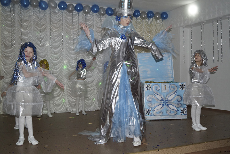 Под завывание вьюги, на сцене актового зала появилась Снежная Королева в сопровождении льдинок. Увидев большой сундук с подарками, Снежная Королева разозлилась: «Это что еще такое? Подарки, елка, дети…Новый год встречаете? Не бывать этому!» И приказала льдинкам принести волшебные замки с ключами. Закрыла Снежная Королева сундук с подарками на пять замков, ключи разбросала по лесу и отправилась в свой ледяной дворец.