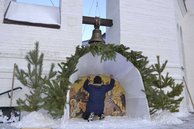 По сложившейся традиции перед храмом устанавливается вертеп из еловых веток. Внутри вертепа – одна из главных святынь – икона Рождества Христова. Эту традицию очень полюбили дети и взрослые, они прикладываются к иконе Рождества Христова и ставят свечи на подсвечник.