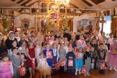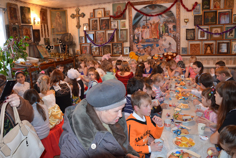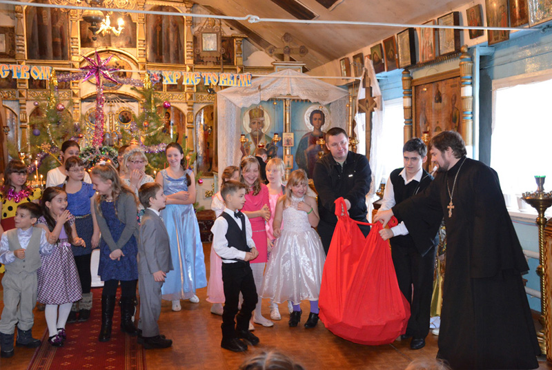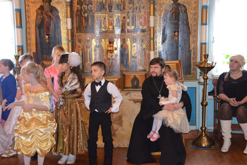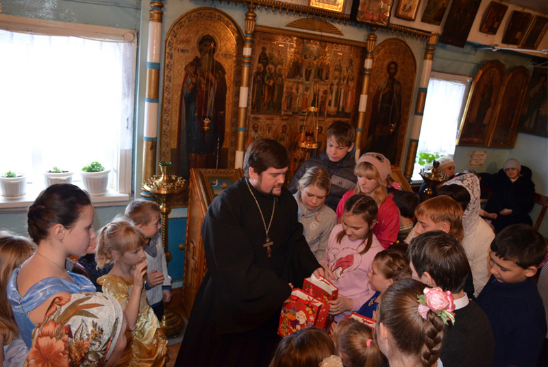 По окончании детских выступлений с праздничными приветствиями и пожеланиями к ребятам и гостям обратился настоятель храма иерей Андрей Пелипенко и вручил всем присутствующим детям подарки. Достойным финалом праздника стали совместное чаепитие с тортом, конфетами и уличное катание с ледяной горки, сооруженной во дворе храма.