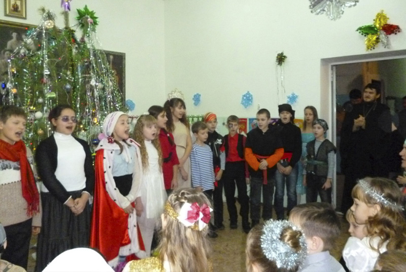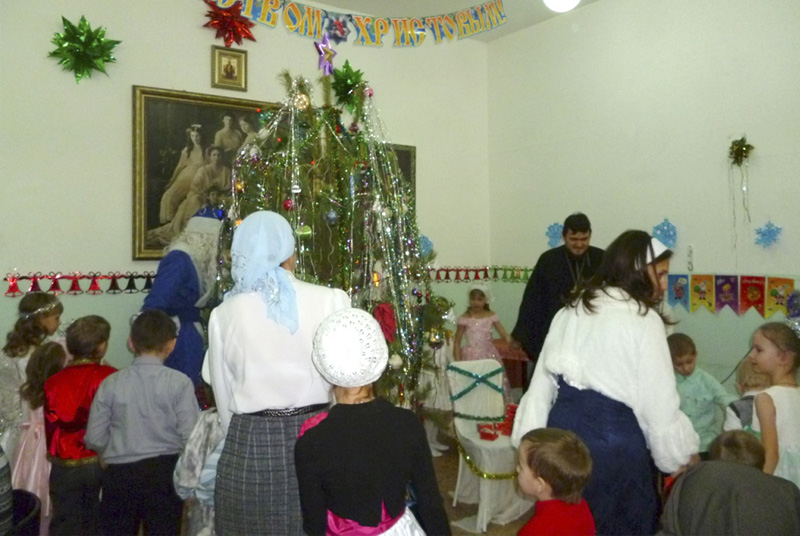 На следующий день, 8 января, ребята пригласили всех на Рождественский утренник. Дети младшей группы (с 4 до 6 лет) водили вокруг елки хороводы во главе с Дедом Морозом. Даже батюшка не усидел на месте. А ребята средней и старшей групп (8-12 лет) показали спектакль «Снежная королева». После праздника каждый получил свой рождественский подарок. Традиционное чаепитие собрало всех за общий стол. Смех, улыбки, веселье – таким было настроение в день рождения Христа.