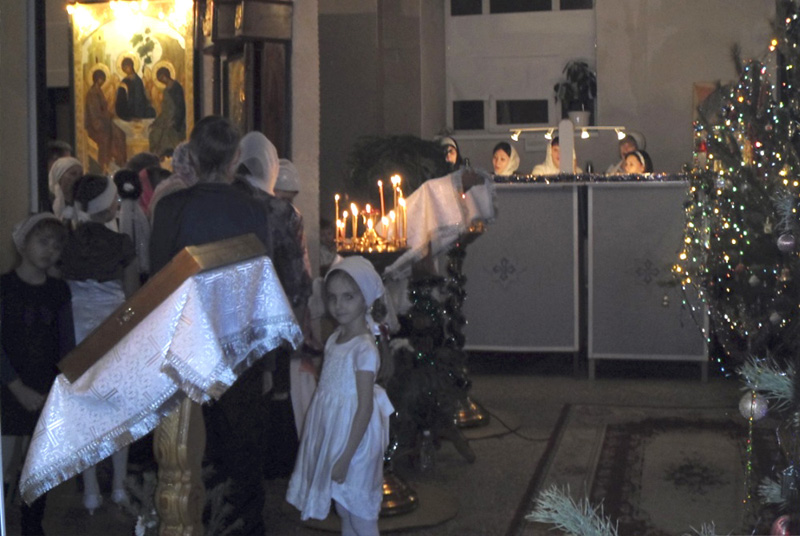 В храм приходили семьями; младенцы, подобно ангелам, нарядные и спокойные, взирали на украшенный вертеп, сверкающие елки. Клирос по доброй традиции при целовании креста исполнял колядки, чем очень порадовал всех. Многие подпевали.