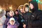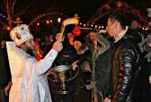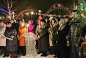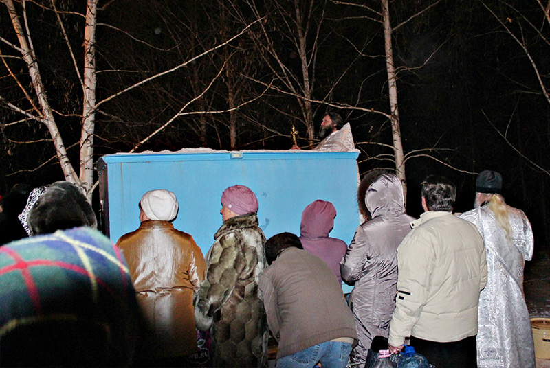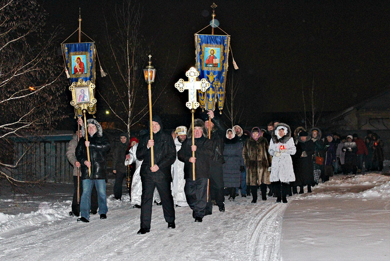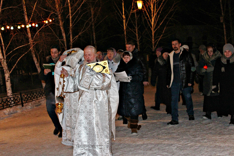По окончании богослужения в ледяном городке «Иордань» о. Анатолий совершил чин Великого освящения воды. Молебен начался к крестного хода на «Иордань». Все молящиеся вышли их храма, затем к ним присоединись горожане, пришедшие за святой водой. Настоятель храма торжественно, над головой, нес Святой Крест.