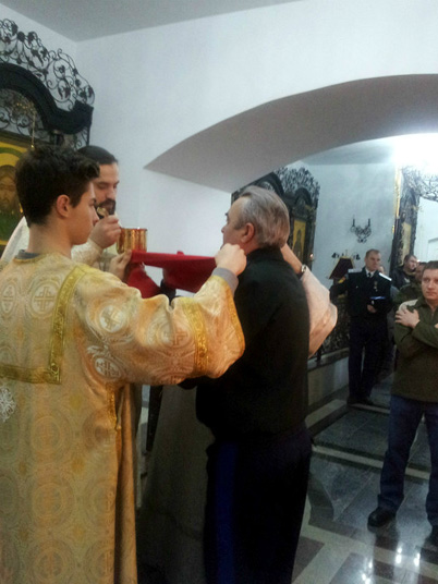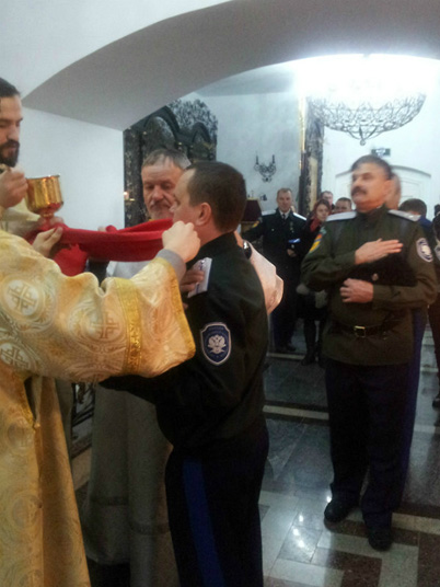 ГАЙ. 28 января 2015 г. В прошедшее воскресенье в память о кровавом геноциде казачества, проводимом советскими властями в годы гражданской войны и в 20-30-е годы ХХ века, по благословению благочинного Гайского округа, настоятеля кафедрального собора св. прав. Иоанна Кронштадтского протоиерея Игоря Никифорова казаки Гайского хуторского казачьего общества во главе с атаманом Владимиром Комаровым причастились святых Христовых Таин.