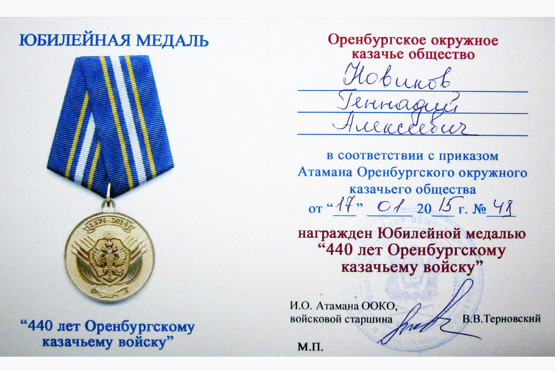 Приказом и. о. атамана ООКО войсковым старшиной В.Терновским от 17 января 2015 года № 41 духовник хутора «Орский» иерей Геннадий Алексеевич Новиков награжден юбилейной медалью «440 лет Оренбургскому казачьему войску». Также священнику вручена атаманская грамота за личный вклад в дело развития и укрепления казачьего общества.