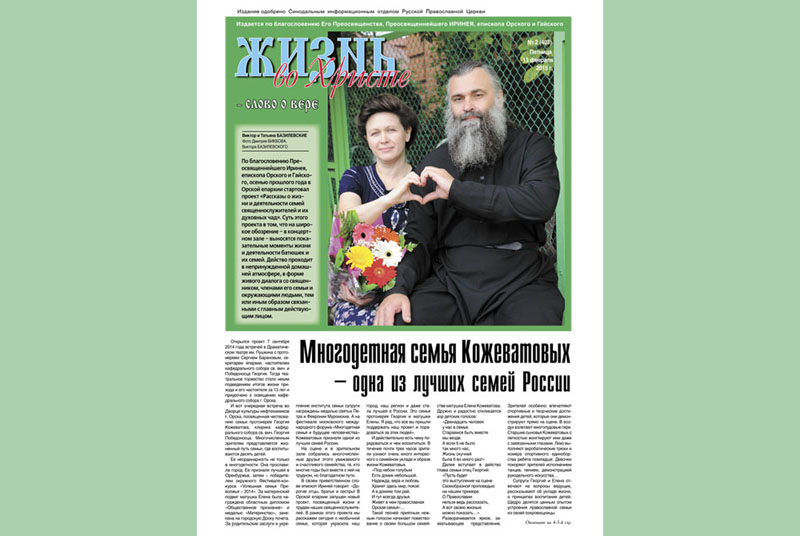По благословению Преосвященнейшего Иринея, епископа Орского и Гайского, осенью прошлого года в Орской епархии стартовал проект «Рассказы о жизни и деятельности семей священнослужителей и их духовных чад». Очередная встреча во Дворце культуры нефтехимиков посвящалась чествованию семьи протоиерея Георгия Кожеватова, клирика кафедрального собора св. вмч. Георгия Победоносца. Многочисленным зрителям был представлен жизненный путь семьи, где воспитываются десять детей. Номер отрывает репортаж Виктора и Татьяны Базилевских «Многодетная семья Кожеватовых – одна из лучших семей России».