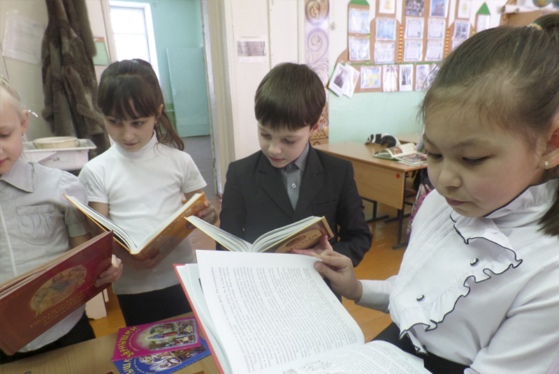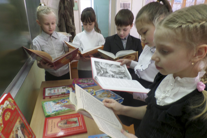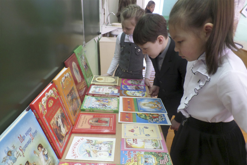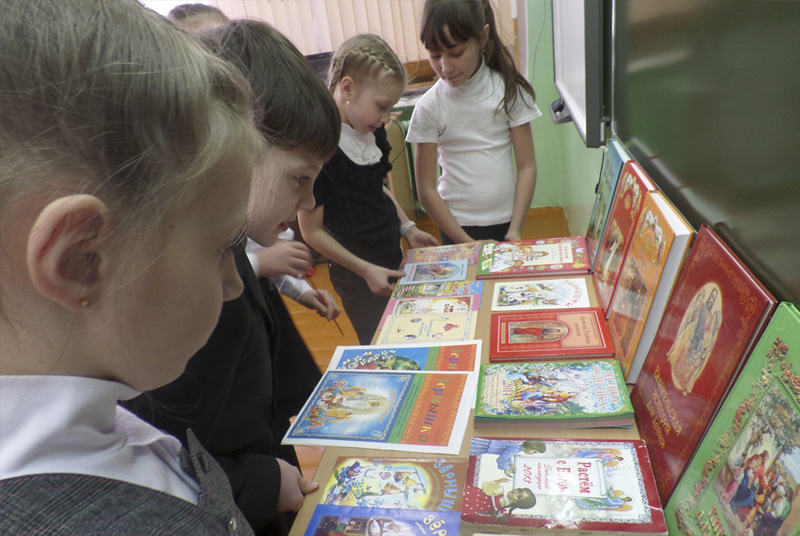 После обзора литературы, проведенного учителем, ребята с огромным интересом рассматривают, пролистывают, зачитывают отрывки из книг с православной выставки в классе. Во время школьных переменок ознакомиться с экспозицией приходили ребята и из соседних классов. В завершение выставки Валентина Николаевна предложила ученикам прочитать приглянувшуюся православную книжку дома. Запись читателей протянулась через весь класс! И это неудивительно, ведь детское сердце особенно чутко ко всему светлому, доброму, жизнеутверждающему.