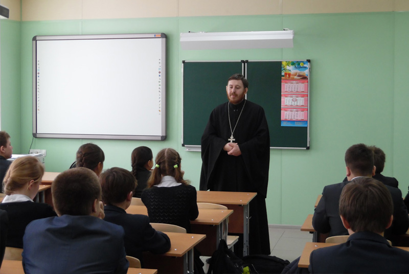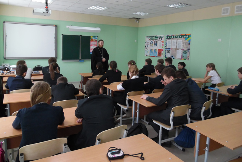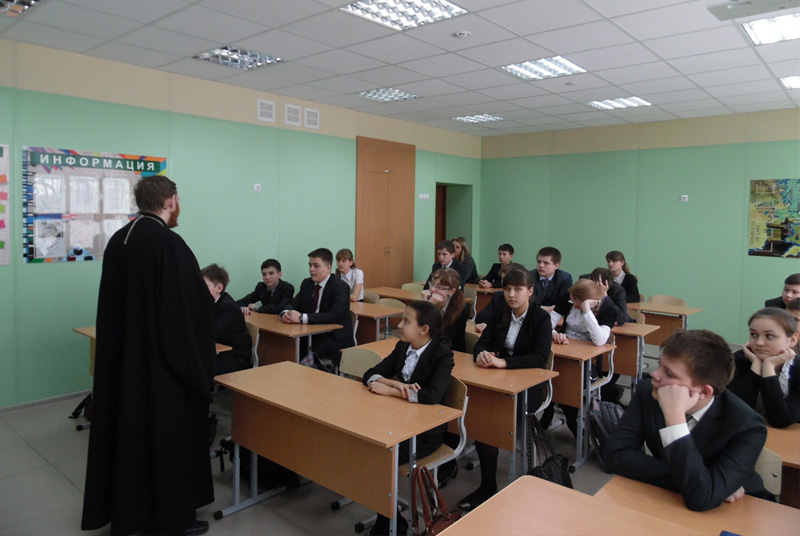НОВОТРОИЦК. 5 марта 2015 г. Помощник благочинного по миссионерскому служению на территории Новотроицкого округа, клирик собора свв. апп. Петра и Павла иерей Сергий Новиков встретился со школьниками МОАУ «Гимназии № 1» г. Новотроицка.