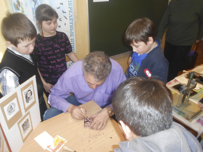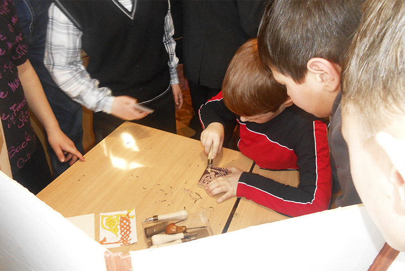 А в «мастерской Ивана Федорова» ребят ждал настоящий сюрприз. Здесь они под чутким руководством Александра Александровича Денищика смогли стать участниками изготовления экслибриса. Для начала на кусочке линолеума стамеской надо было вырезать рисунок (что на самом деле очень непросто), а затем с помощью краски и пресса под руками ребят рождались печатные буквицы и узоры. Да, такое не каждый день увидишь! На лицах детей – восторг и радость!
