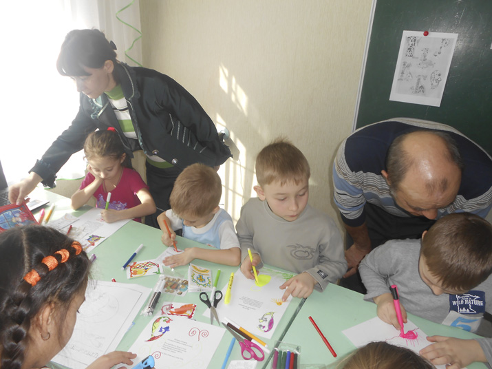 После теории всех присутствующих пригласили в творческие мастерские. Ребята постарше отправились в «мастерскую Ивана Федорова», а малыши – в «рукописную Нестора Летописца». Каждый на своем месте смог прикоснуться к чуду рождения книги. В мастерских царила творческая обстановка. Малыши работали над созданием общего детского молитвослова. У каждого была своя страничка, которую надо было красиво оформить. А затем вместе с преподавателем Светланой Валентиновной Денищик все эти странички соединили и поместили в красочную обложку.