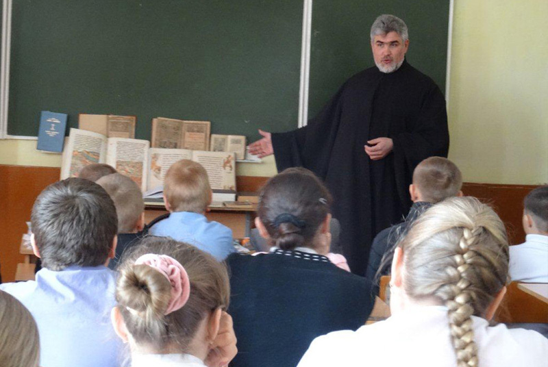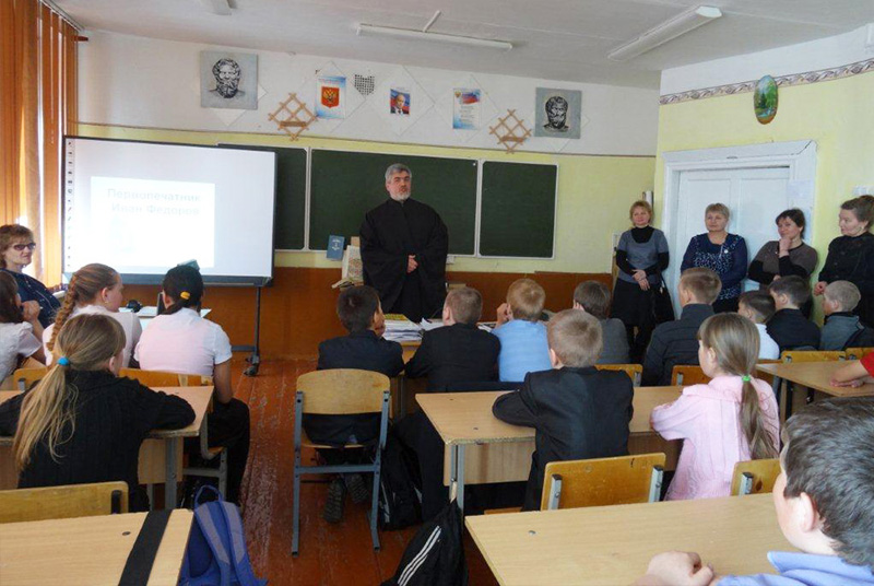 Встреча посвящалась Дню православной книги. Школьникам была прочитана лекция об истории православного книгоиздания и первопечатнике Иване Федорове. Священник рассказал, когда и почему был установлен День православной книги, а также поведал о её роли в современном мире. Лекция сопровождалась презентацией и выставкой православных книг: богослужебных, летописных, фотокопий первой азбуки, Закона Божьего.