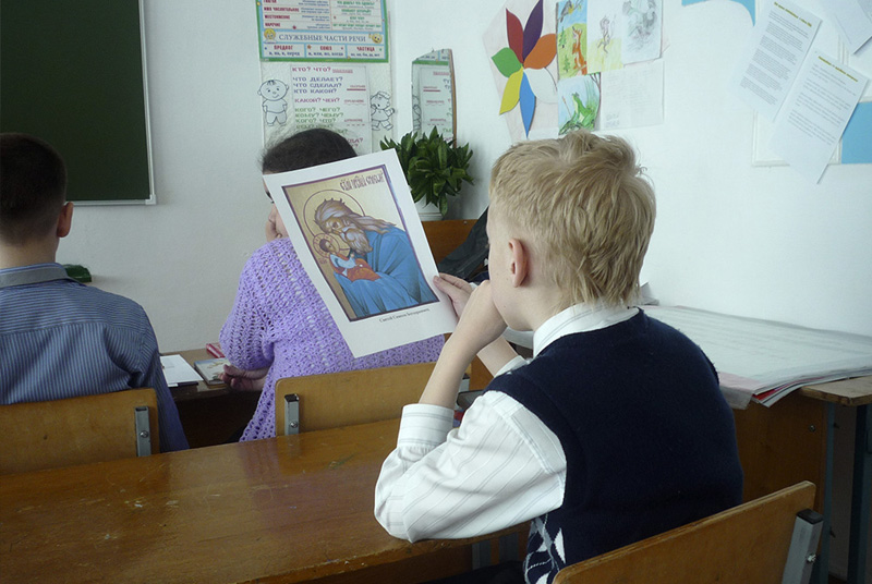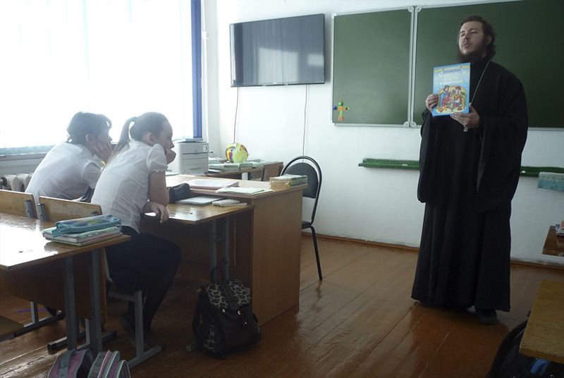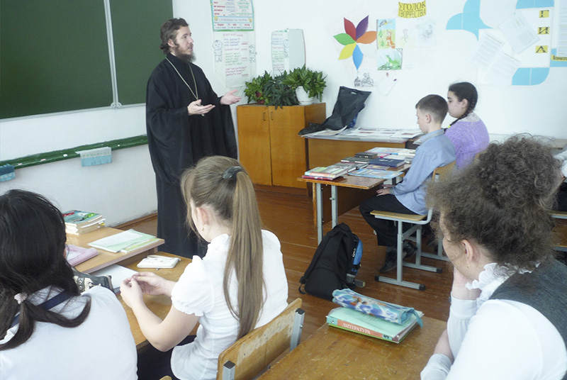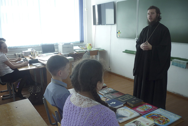 ХАБАРНОЕ. 19 марта 2015 г. Настоятель храма святого апостола Андрея Первозванного иерей Евгений Селивёрстов провёл встречу с учащимися общеобразовательной школы № 4 села Хабарного.