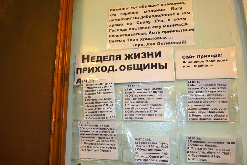 ЯСНЫЙ. 30 марта 2015 г. С 30 марта в храме св. вмч. и целителя Пантелеимона начал действовать Уголок православной общины, созданный катехизатором храма (автором этих строк) совместно с активом прихода.