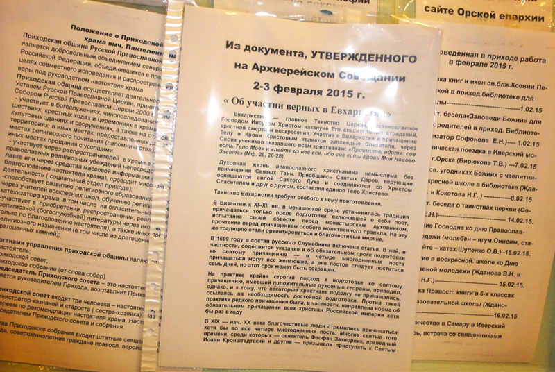 Приходская община храма нуждается в таком уголке, так как, например, очень важное для определения сущности жизни современного православного прихода февральское выступление Святейшего Патриарха Кирилла воспринято некоторыми в храме как призыв к бесконечной культмассовой тусовочной деятельности. Поэтому уставные документы, где очень четко изложены права и обязанности православной общины, виды деятельности прихода, задачи приходского совета и собрания, становятся помощниками в понимании того, что есть сама православная община. А документы Орской епархии, Архиерейских совещаний, доведенные до прихожан, помогают им понять общецерковное направление православной жизни, узловые моменты, на которые обращает внимание Русская Православная Церковь, те события, которые и определяют деятельность прихода в текущем году.