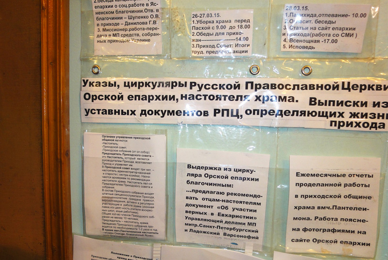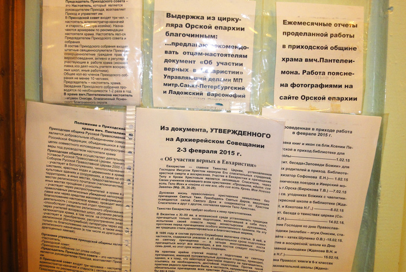 Настоятель Пантелеимоновского храма игумен Онисим (Пашинов) предложил прихожанам создать такой уголок, где сосредоточены и уставные документы прихода, и циркуляры Орской епархии, и данные Архиерейских совещаний, и лента событий приходской жизни, и месячный отчет мероприятий прихода.