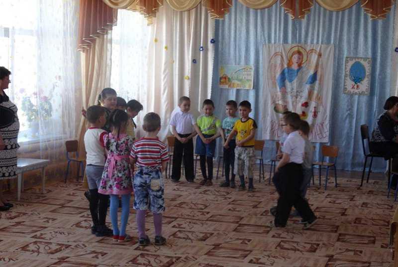 В игровой форме воспитанники детского сада познакомились с главным праздником года – Светлым Христовым Воскресением. Ребята с радостью читали стихи и пели песни, посвященные празднику, водили хороводы. Священник поздравил ребят с Пасхой Господней и научил пасхальному приветствию: «Христос воскрес – Воистину воскрес!»