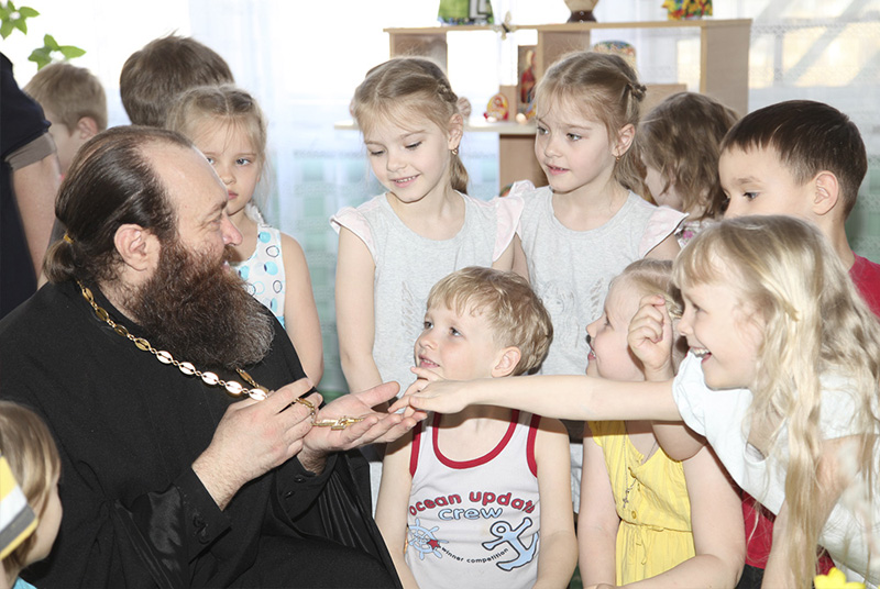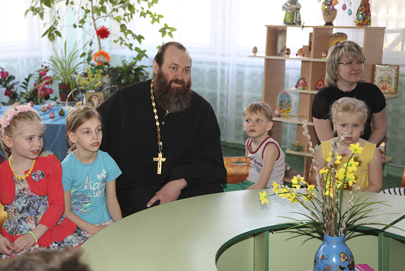 ОРСК. 13 апреля 2015 г. Настоятель храма св. вмч. и целителя Пантелеимона г. Орска протоиерей Александр Божко посетил д/с № 121, где проходила Пасхальная выставка.