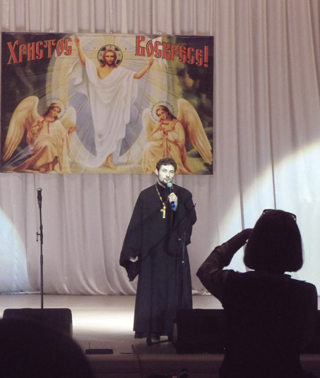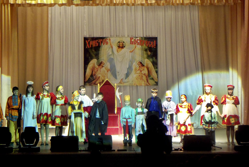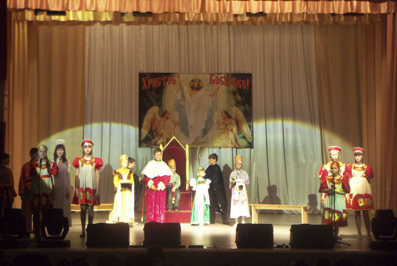 Программу концерта открыл настоятель храма святителя Николая Чудотворца (микрорайон Южный) иерей Максим Малюта, который обратился к зрителям с Пасхальным поздравлением. Затем выступили воспитанники приходской воскресной школы. Ребята показали пасхальную сказку-сценку «Мудрый царь».