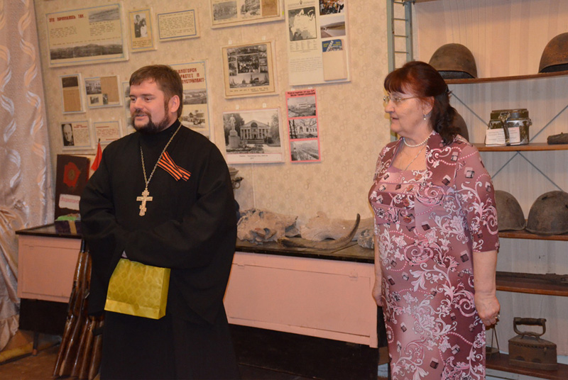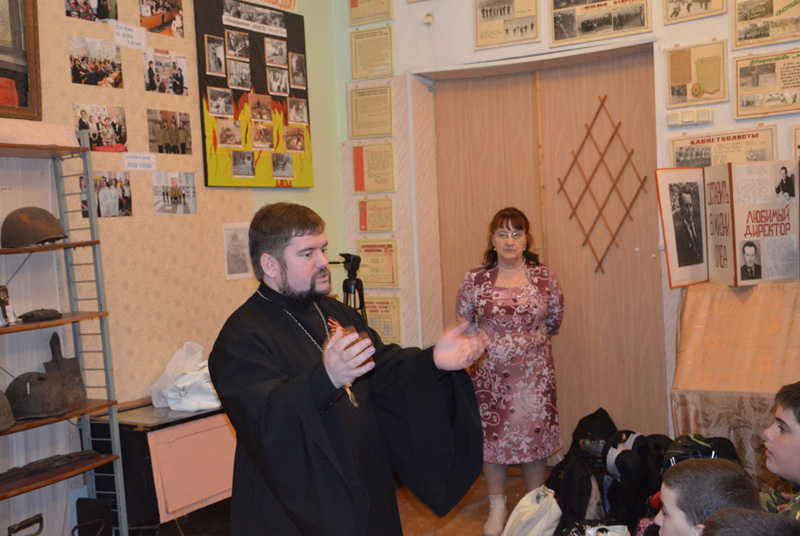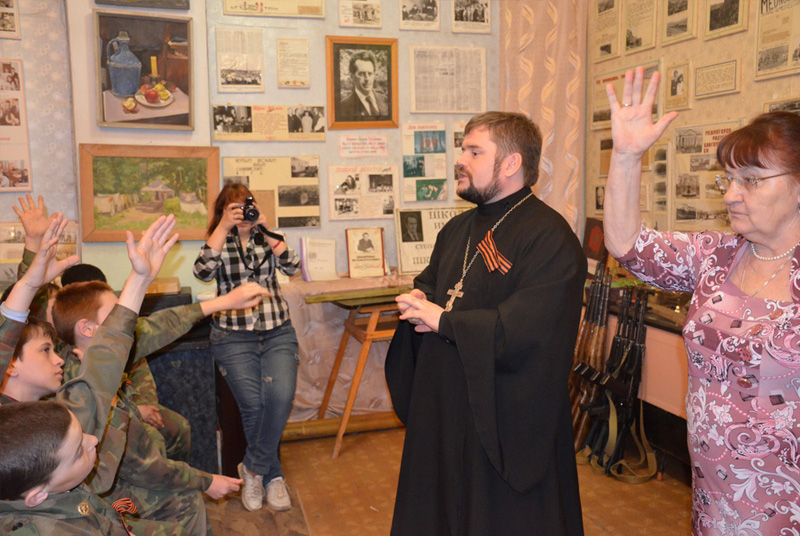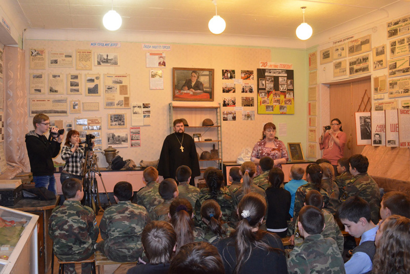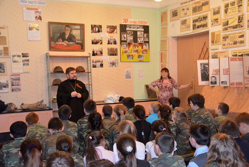 МЕДНОГОРСК. 27 апреля 2015 г.В музее средней общеобразовательной школы №1 состоялось мероприятие, посвященное 70- летнему юбилею Великой Победы. На встрече побывал настоятель храма святителя Николая Чудотворца г. Медногорска поселка Заречного иерей Андрей Пелипенко.