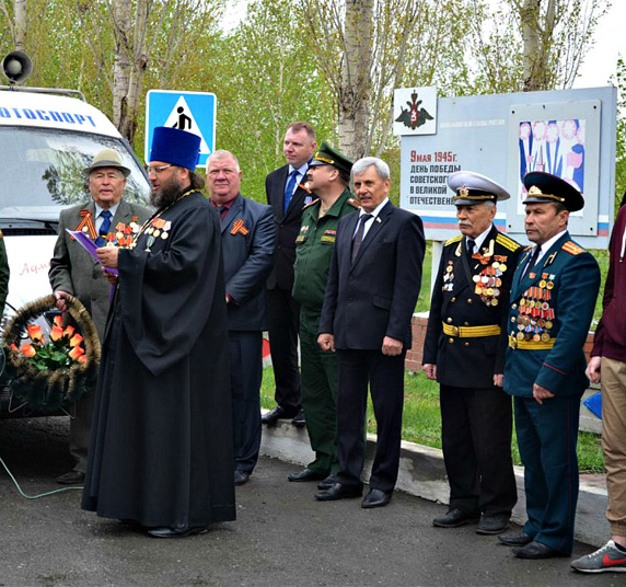ГАЙ. 7 мая 2015 г. Благочинный Гайского округа, настоятель кафедрального собора святого праведного Иоанна Кронштадтского г. Гая протоиерей Игорь Никифоров принял участие в митинге в ходе встречи участников автопробега «Спасибо деду за Победу».