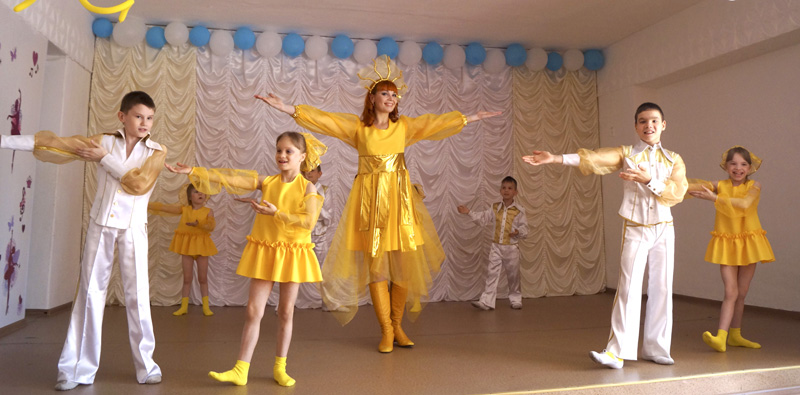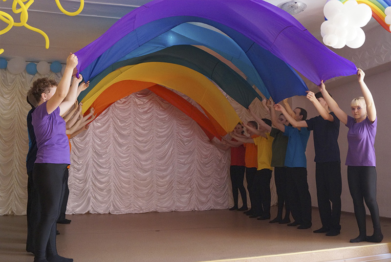 «По воду» в исполнении педагогов О. Корчагиной и О. Хабибулиной. Оранжевая дуга подарила песню «Здравствуй, мир!» в исполнении Дианы Подольских. Желтый цвет похож на солнышко и поэтому подарил всем присутствующим в зале веселый танец «Солнышко мое» в исполнении младшей группы хореографической студии. Спирин Владимир и Диана Подольских от имени зеленого цвета Радуги исполнили куплеты песни «Можно летом» на мотив песни «Учат в школе», а весь зал пел припев «Можно летом, можно летом, можно летом». Получился большой, дружный хор! Голубой цвет Радуги приготовил для зрителей очень красивый танец «Цветы» в исполнении девочек младшего возраста, а чтобы у всех было праздничное настроение, синий цвет подарил песню «Хорошее настроение» в исполнении Спирина Владимира и Подольских Дианы. Также по традиции всех ожидал, ставший уже традиционным в детском доме, зажигательный флешмоб.