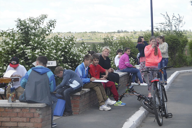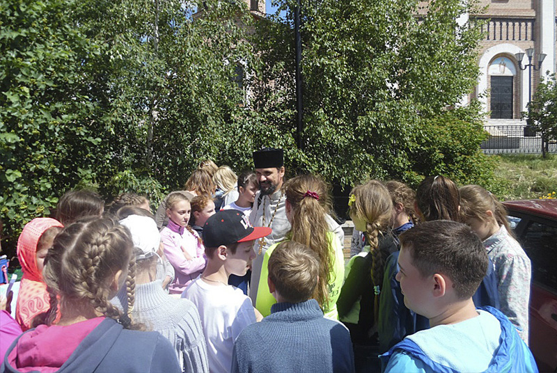 НОВОТРОИЦК. 8 июня 2015 г. Во время пленэрной практики дети и преподаватели встретились с настоятелем храма протоиереем Сергием Квашой, который ответил на вопросы юных художников и подарил ребятам книги «Пасхальная весть», автором которой является Святейший Патриарх Московский и всея Руси Кирилл.