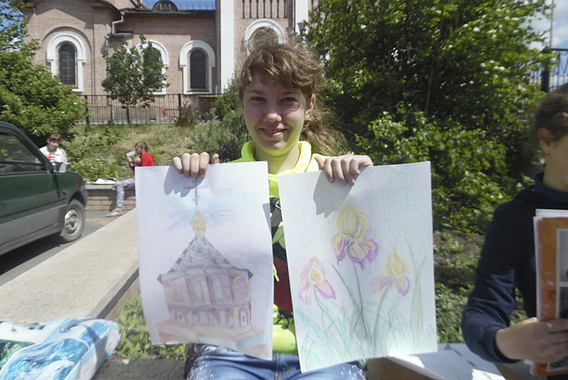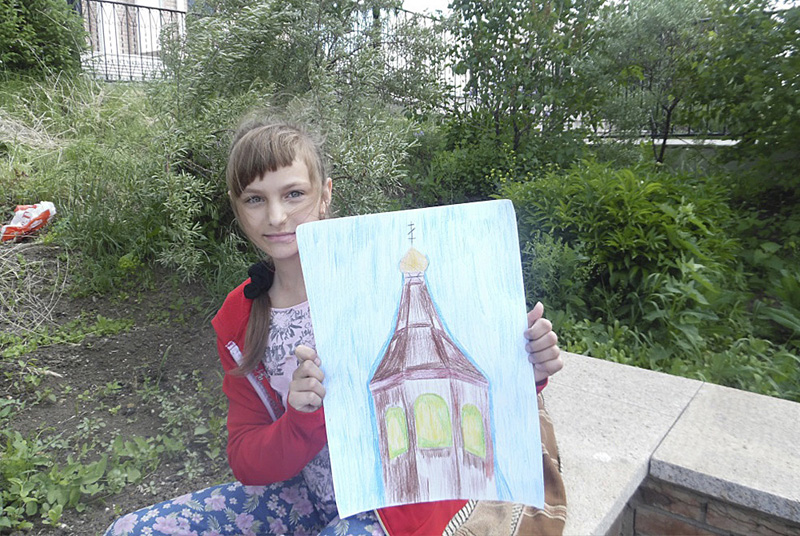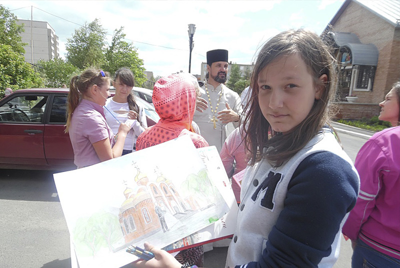 На встрече с батюшкой юные художники с удовольствием показали свои маленькие шедевры, которые у них получились во время занятий возле храма.